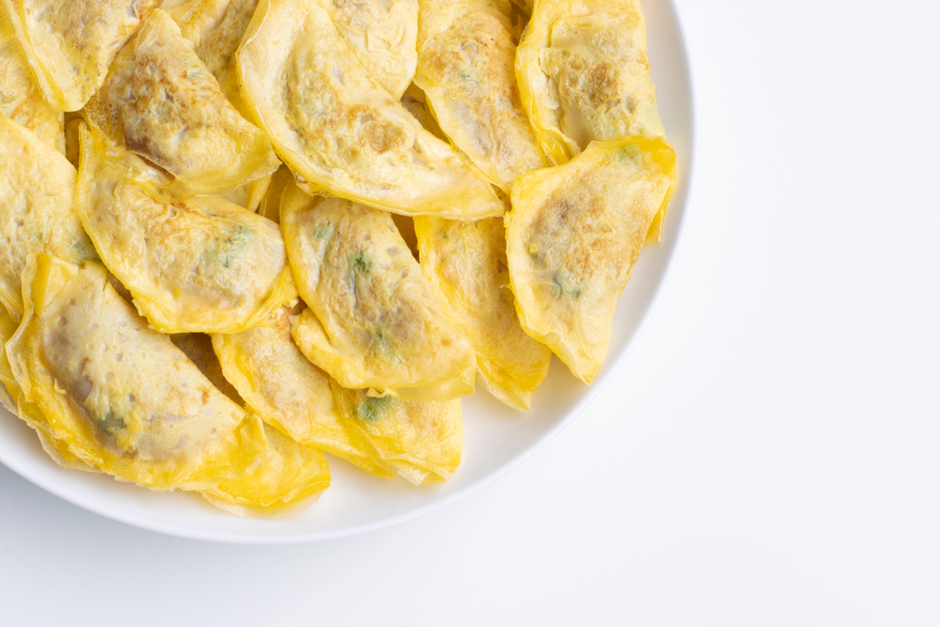 ● 用湯匙取餡料,放蛋皮中央,按照一般包餃子的方式包起來